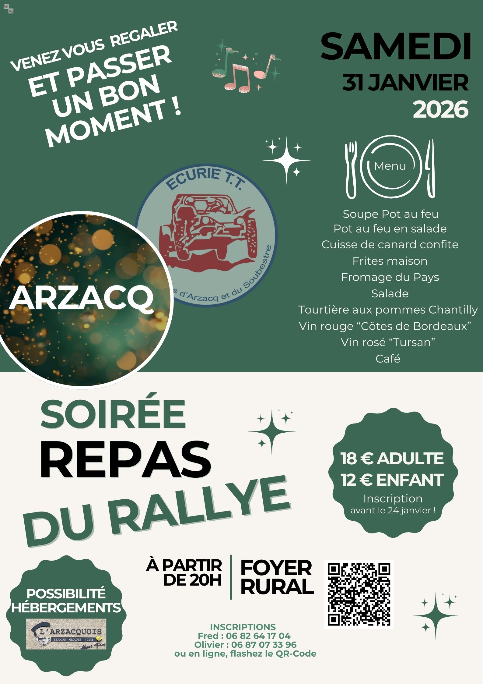 La 42ème édition du Rallye TT des Collines d’ARZACQ au lieu le 28 février, 1 et 2 mars 2025, vous trouverez les éléments nécessaires ci-dessous. NOUVEAU Bonjour à toutes et à tous,Vous nous avez fait le plaisir de vous engager à la 42ème édition du Rallye des Collines d’Arzacq et du Soubestre, nous vous en […]